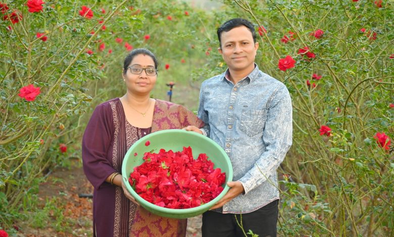 वडगाव आनंद येथील उच्चशिक्षित दाम्पत्याने माळरानावर फुलविली गुलाबाची शेती