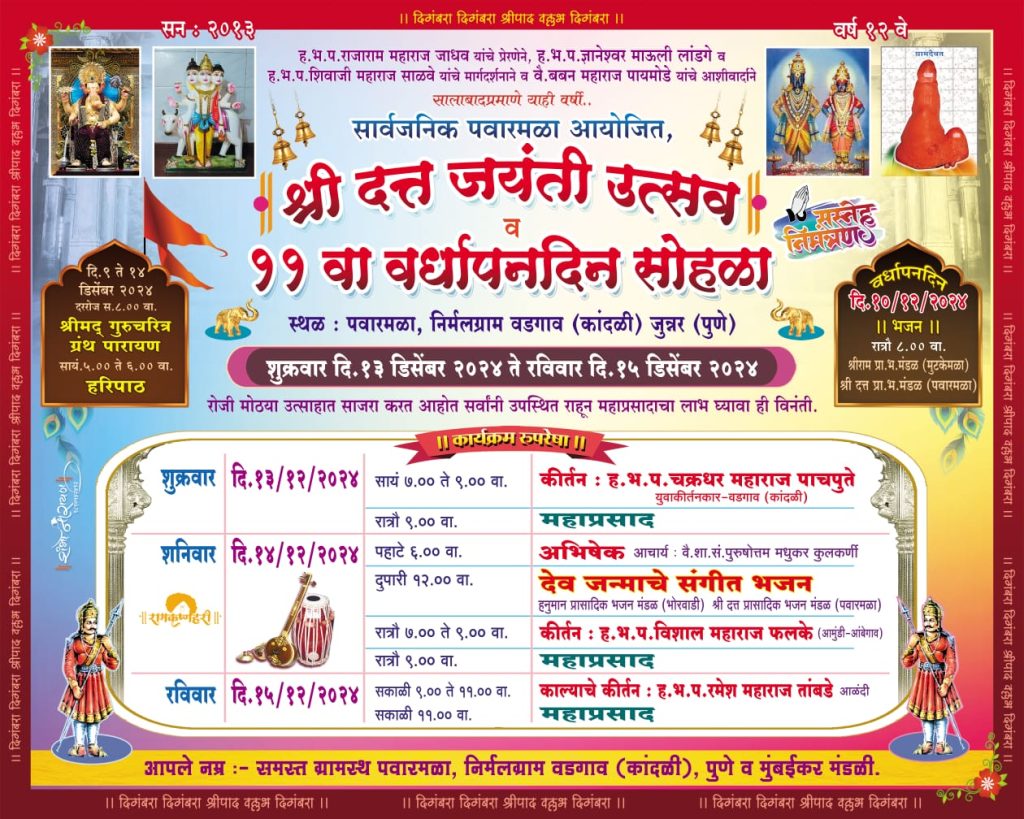 श्रीदत्त जयंती व श्रीदत्त मंदिर ११ व्या वर्धापन दिनानिमित्त आदर्शगाव वडगाव कांदळी येथील पवार मळा याठिकाणी अखंड हरिनाम सप्ताह चे आयोजन करण्यात आले.
